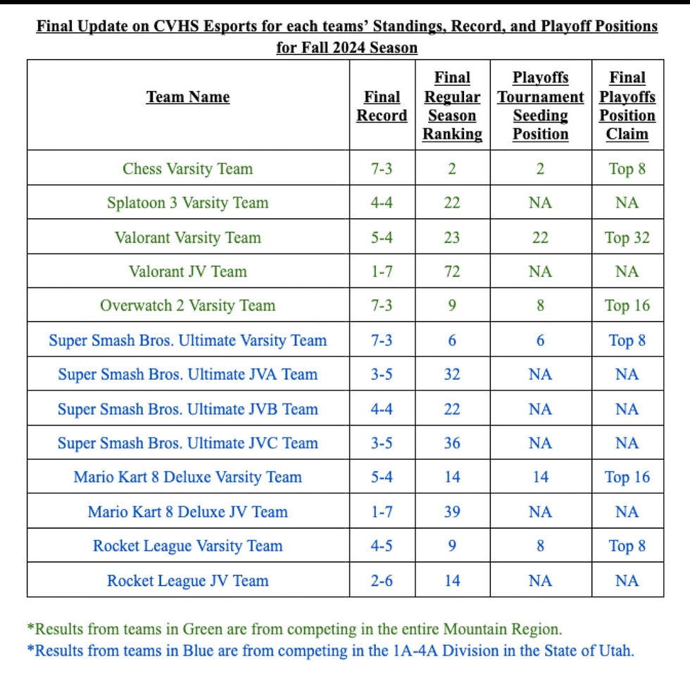 Canyon View Esports has just wrapped up an incredible fall season, and the results are nothing short of amazing! Canyon View E-Sports teams have truly shined this year, and to celebrate, here are a few highlights from their fall season! Their Chess Varsity team secured a spot in the top 8 of the Mountain Range Playoffs, boasting an impressive record of 7-2! That’s not all! Their Super Smash Bros Varsity team also made waves, placing in the top 8 in the competitive 1A-4A division of the state of Utah! And let’s not forget our Rocket League Varsity team, which battled their way to the top 8 in the same division. A huge shoutout to all the esports players your hard work and dedication have paid off! Way to go, Canyon View!
